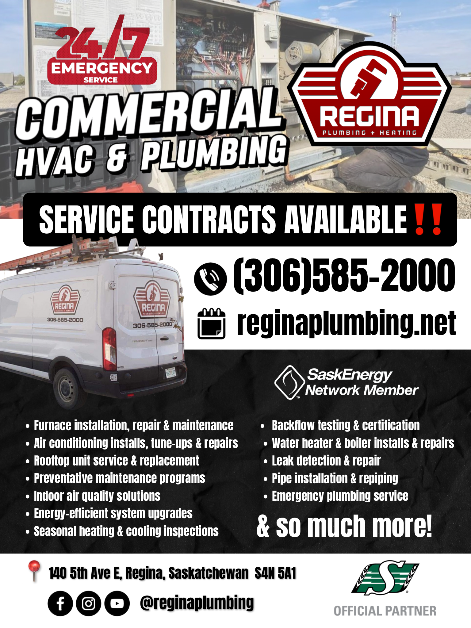 Regina Plumbing & Heating has an annual contract with 2 of the highest traffic billboard locations in Regina, one of which is right outside of Mosaic Stadium. Creative is switched out seasonally.